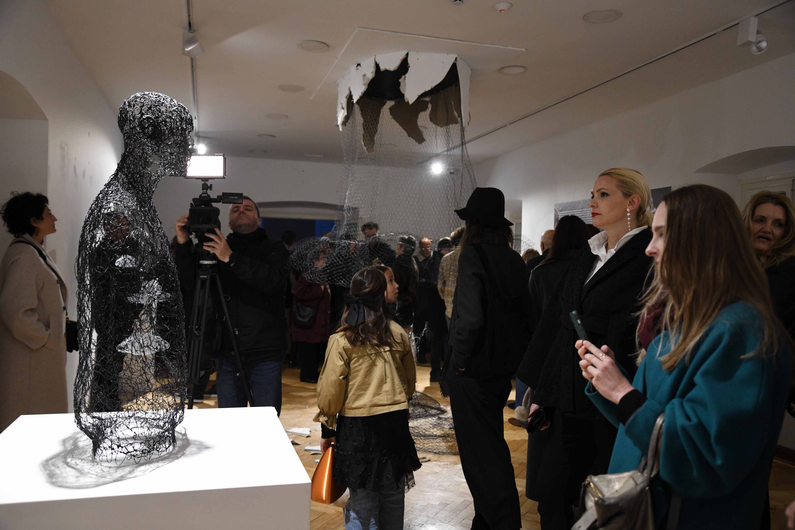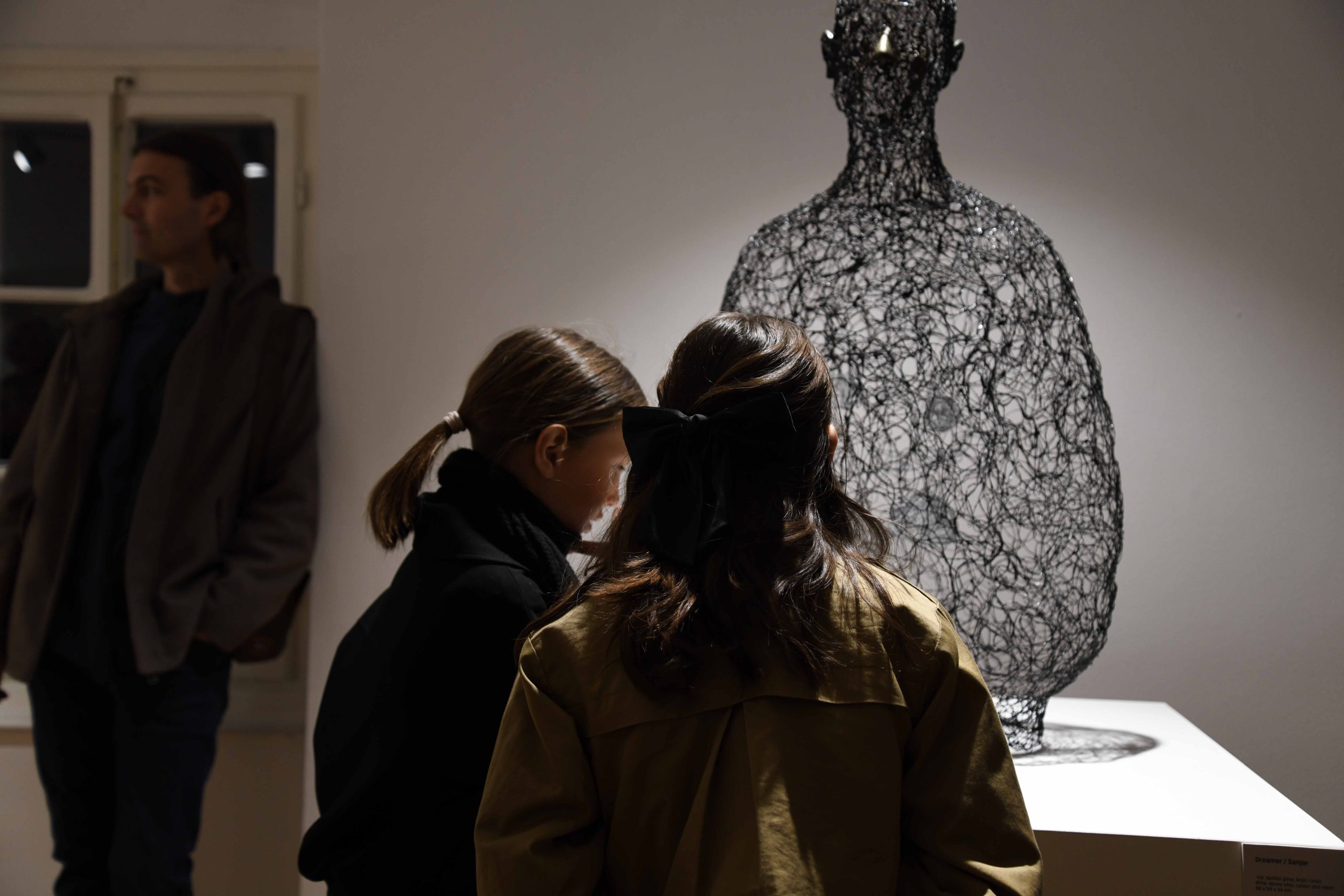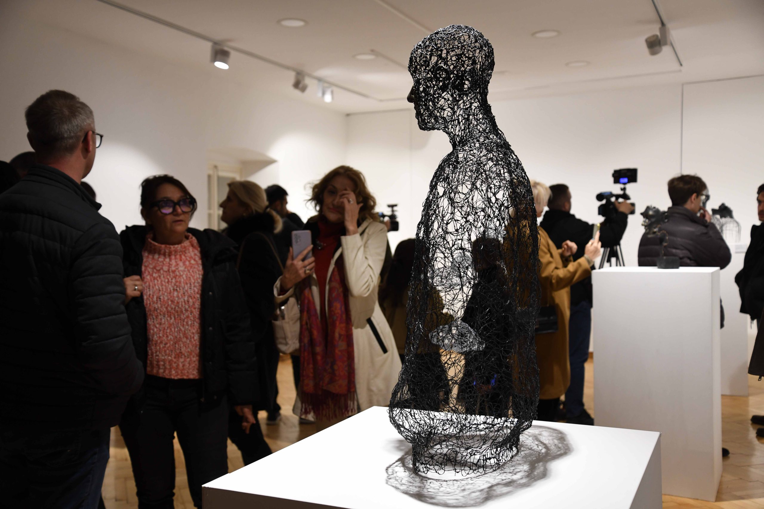 The exhibition presents a cycle of portraits and stylized figures through which, as curator Marina Čelebić pointed out, the artist “explores the inner layers of identity through wire, clay, and light installations.” She emphasized that the sculptures convey “the beauty of imperfection, introspective moments, and emotional depth.”