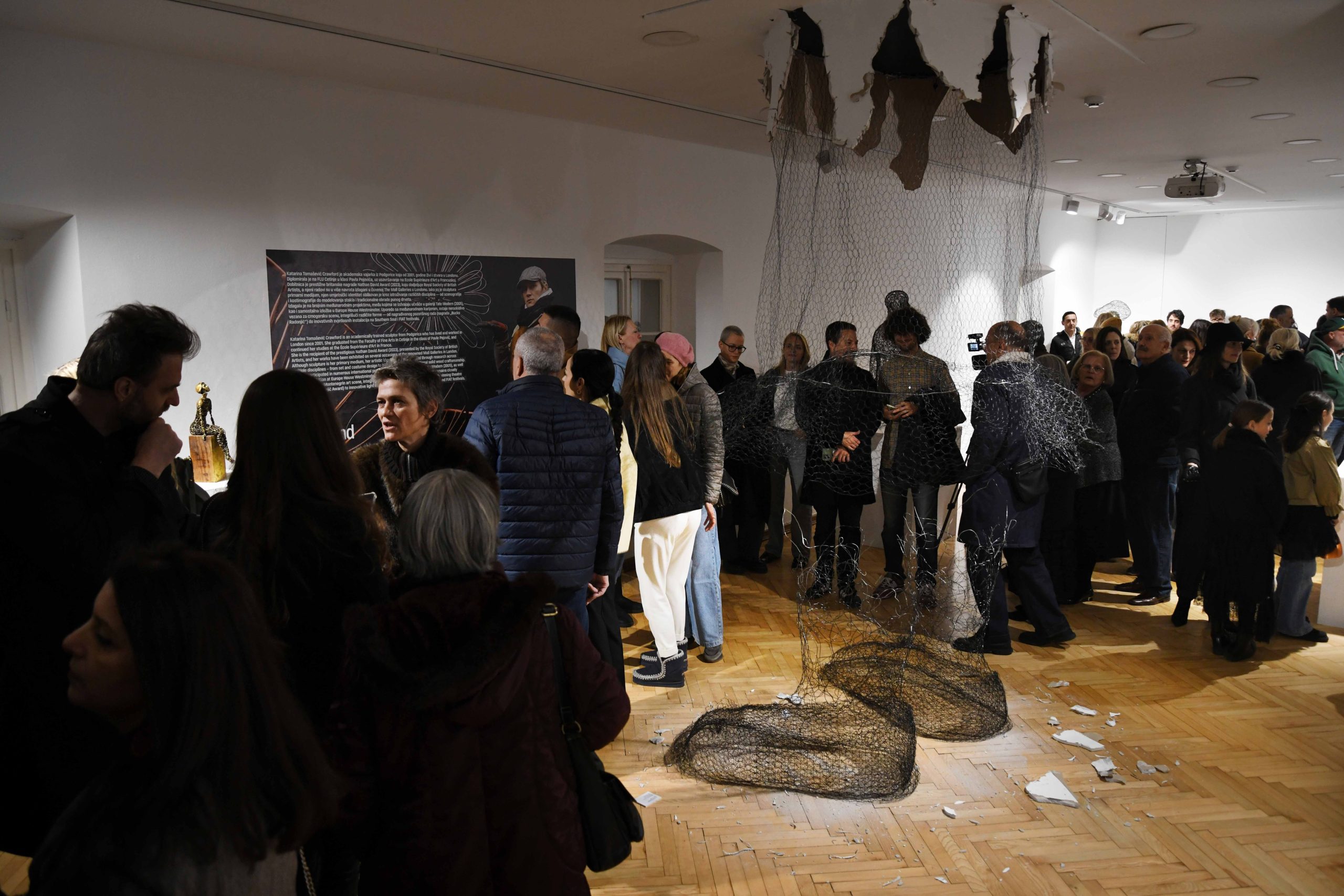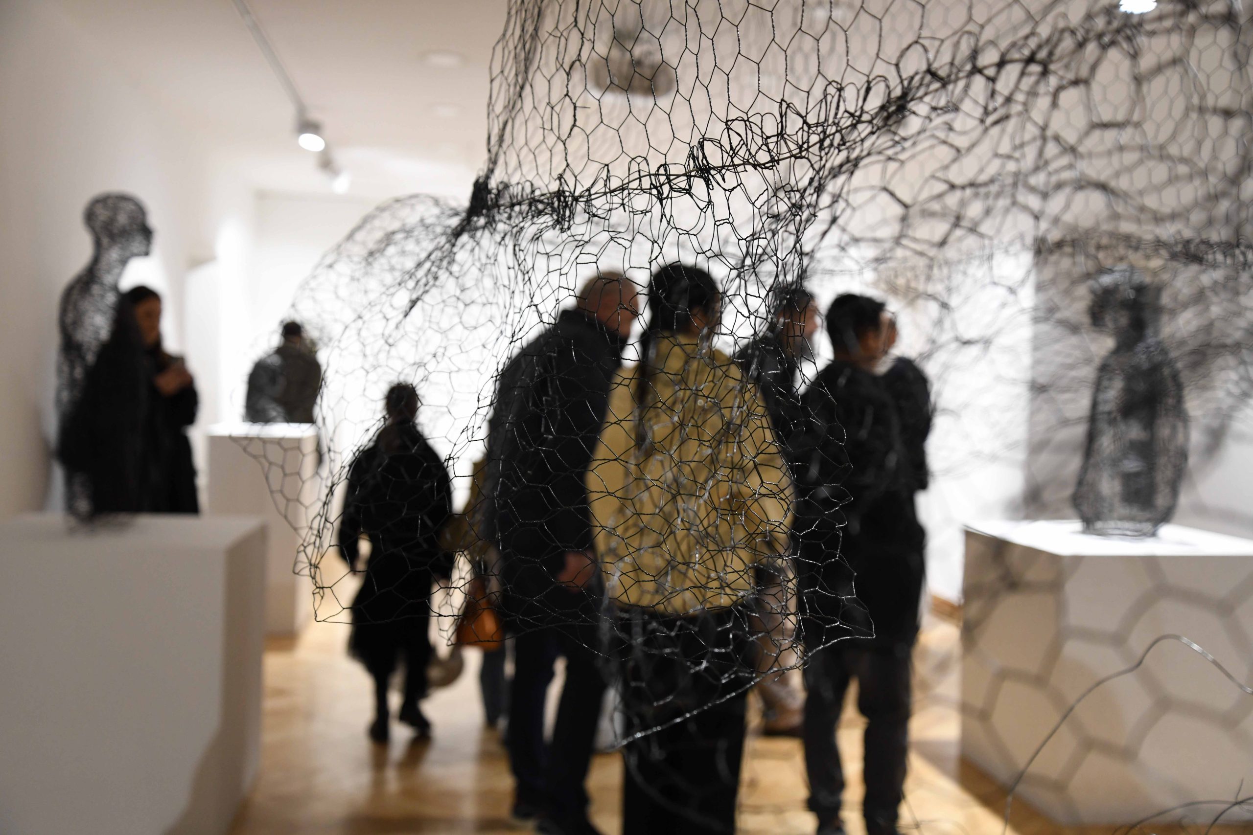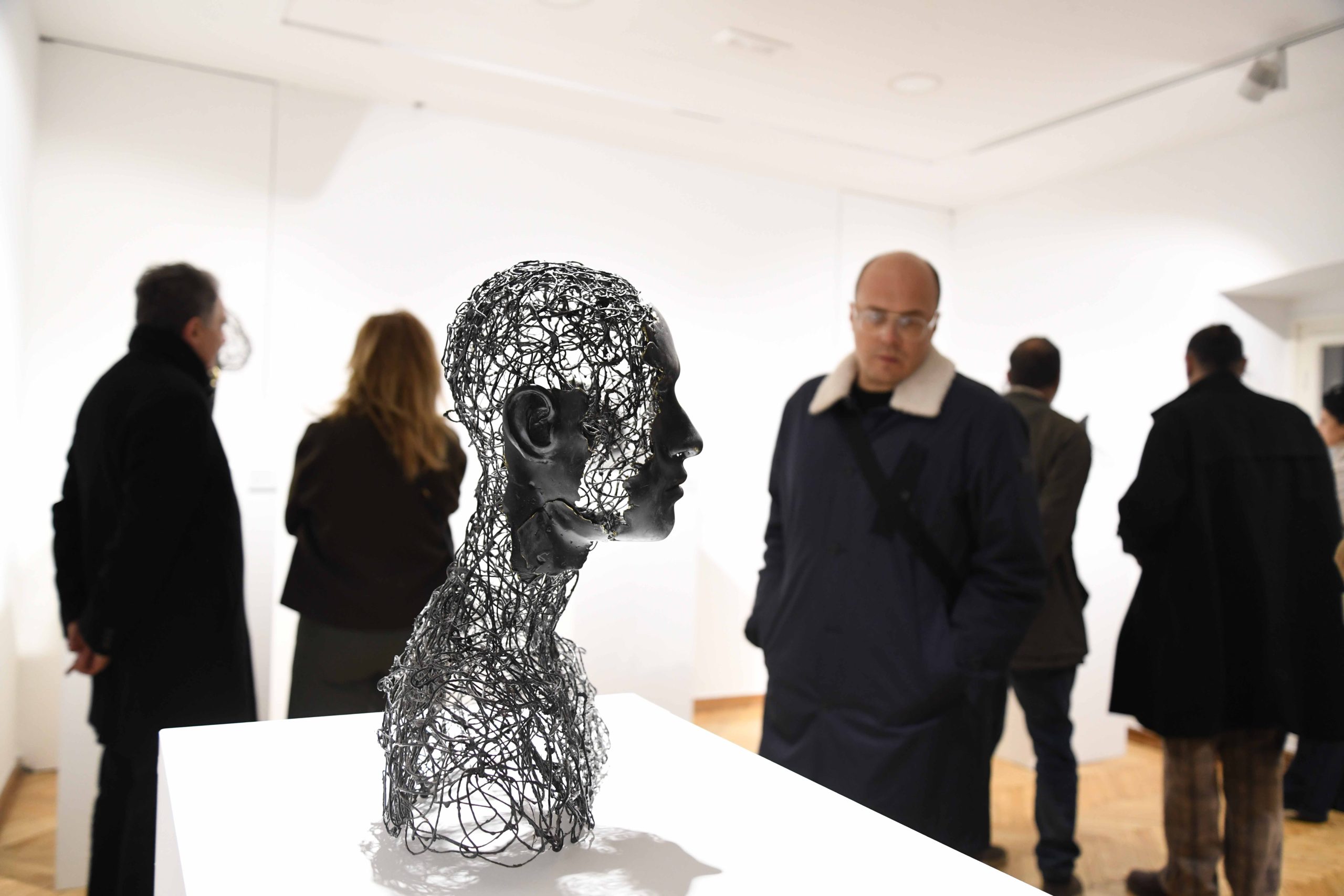 The exhibition presents a cycle of portraits and stylized figures through which, as curator Marina Čelebić pointed out, the artist “explores the inner layers of identity through wire, clay, and light installations.” She emphasized that the sculptures convey “the beauty of imperfection, introspective moments, and emotional depth.”